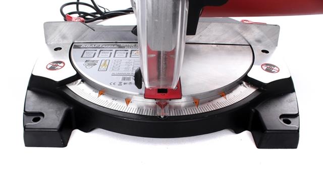 Vybavený kotúčmi s priemerom 210 mm, rozsah rezu je 120 x 50 mm. Možnosť sklopenia čepele a otočenia stolu do uhla 45° vľavo a vpravo.