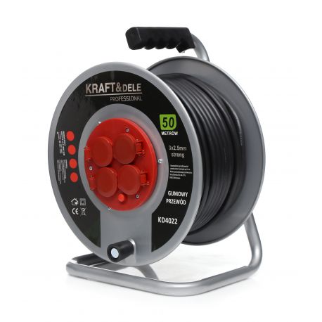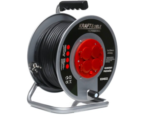 Záhradný predlžovací kábel na kovovom bubne značky Kraft&Dele model KD4021 sa používa na pripojenie domácich elektrických zariadení ako elektrická kosačka, vysávač do auta a pod.