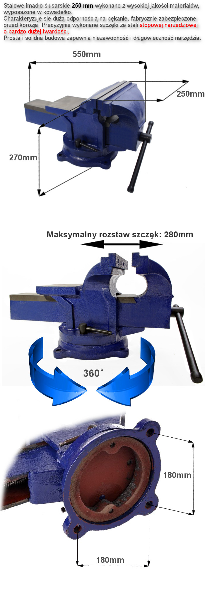 Rotačný 360° zverák so šírkou čeľustí 250 mm poľskej značky Kraft&Dele model KD1105 je vyrobený z vysoko kvalitných materiálov. Má vysokú odolnosť proti praskaniu a je chránený proti korózií. Jednoduchá a pevná konštrukcia zaručuje spoľahlivosť a životnosť nástroja.