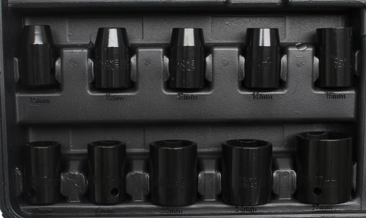 • 10 kusov nástavcov 1/2" z CrV: 9, 10, 11, 13, 14, 17, 19, 22, 24, 27 mm