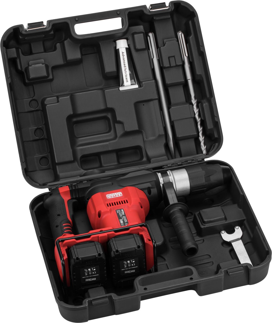 Vysoká rýchlosť až 1050 ot./min umožňuje rýchlu a efektívnu prácu, zatiaľ čo upevňovací systém SDS-PLUS umožňuje pohodlnú výmenu príslušenstva bez použitia náradia. Sada obsahuje dve vysokokapacitné 4Ah batérie. Dodávaná nabíjačka umožňuje rýchle nabitie batérií a návrat do práce bez zbytočných prieťahov.
