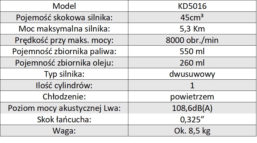 Píla KRAFT&DELE s výkonom 5,3 HP je jednou z najdynamickejších píl s kompaktnou a pevnou konštrukciou. Funguje spoľahlivo aj po rokoch používania - drevostavebné práce, farmárske a poľnohospodárske práce, práce v sade. Univerzálny - ideálny pre domáce a lesné práce. Silná, odolná a spoľahlivá píla, ktorá splní tie najvyššie požiadavky. Píla sa od ostatných modelov líši tým, že je vybavená palivovým čerpadlom a ľahšou a odolnejšou konštrukciou. Píla sa vyznačuje veľmi dobrou kvalitou spracovania a veľmi dobrými komponentmi použitými pri jej konštrukcii. Píla má systém ľahkého štartu - EASY START - stačí na spustenie jedného ťahu - a systém tlmenia vibrácií potrebný pri práci s hrubým drevom. Na pohon píly sa používa palivová zmes určená pre dvojtaktné motory. Benzín by sa mal miešať s olejom v pomeroch určených výrobcom. Pomer zmesi použitej v zariadení je 1:25 (1 diel oleja + 25 dielov benzínu). Určené okrem iného na: prípravu palivového dreva, stavebné práce v dreve, práce na farmách a poľnohospodárstve, v sadoch, rúbanie stromov, starostlivosť o stromy a pod. Parametre: • Model KD5016 • Zdvihový objem motora: 45 cm3 • Maximálny výkon motora: 5,3 Km • Otáčky pri maximálnom výkone: 8000 ot./min. • Objem palivovej nádrže: 2 0 ml Objem nádrže: 5 il 5 dvojtakt • Počet valcov: 1 • Chladenie: vzduch • Hladina akustického výkonu Lwa: 108,6dB(A) • Rozteč reťaze: 0,325" • Hmotnosť: Cca 8,5 kg Sada obsahuje: • Benzínovú reťazovú pílu KRAFT&DELE KD5016 • Kryt vodiacej lišty • Sada kľúčov (kľúč na zapaľovacie skrutky, skrutkovač na miešanie oleja s plynovými sviečkami a skrutkovačom) • Retiazka • 40 cm dlhé vedenie • Účtenka alebo faktúra • Originálne balenie