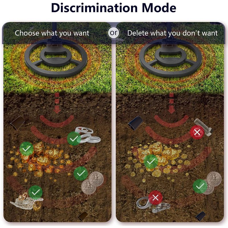 Táto funkcia umožňuje detektoru rozlišovať medzi typmi kovov a presne rozlíšiť typy železných kovov od neželezných kovov (zlato, striebro, meď, hliník, zinok, olovo, platina). To vám umožní filtrovať malé predmety, ako sú čiapky, šupiny alebo črepy.