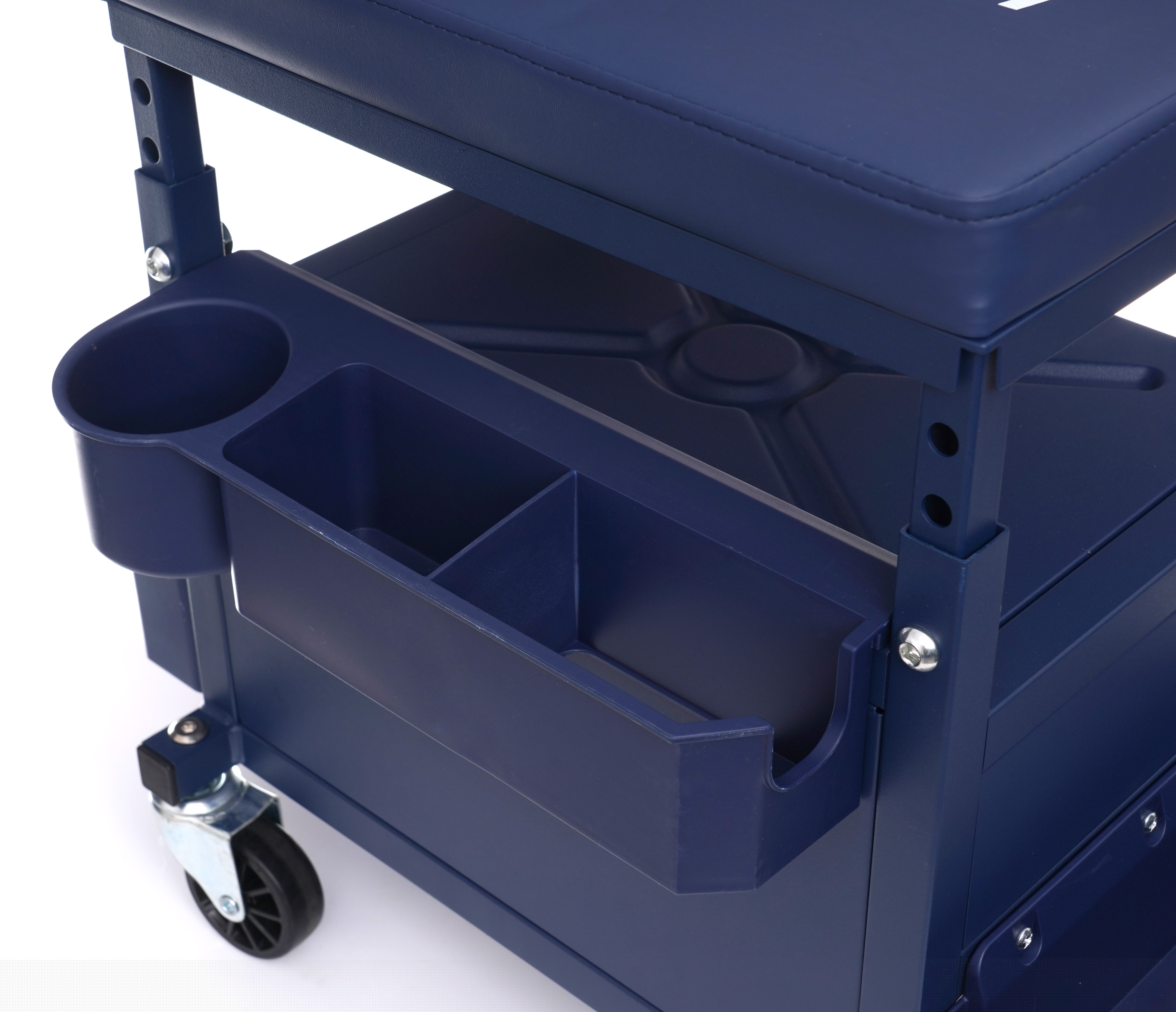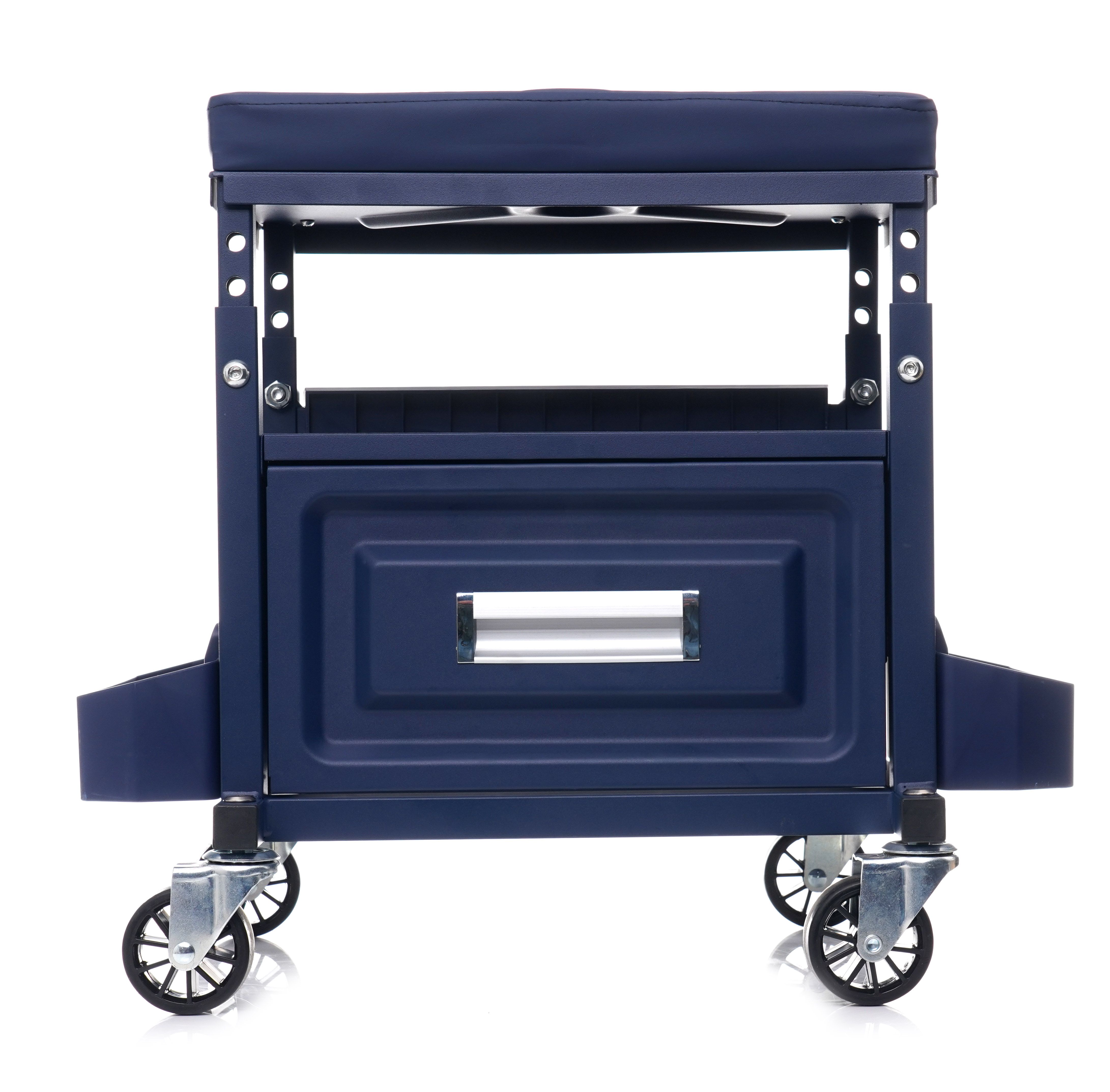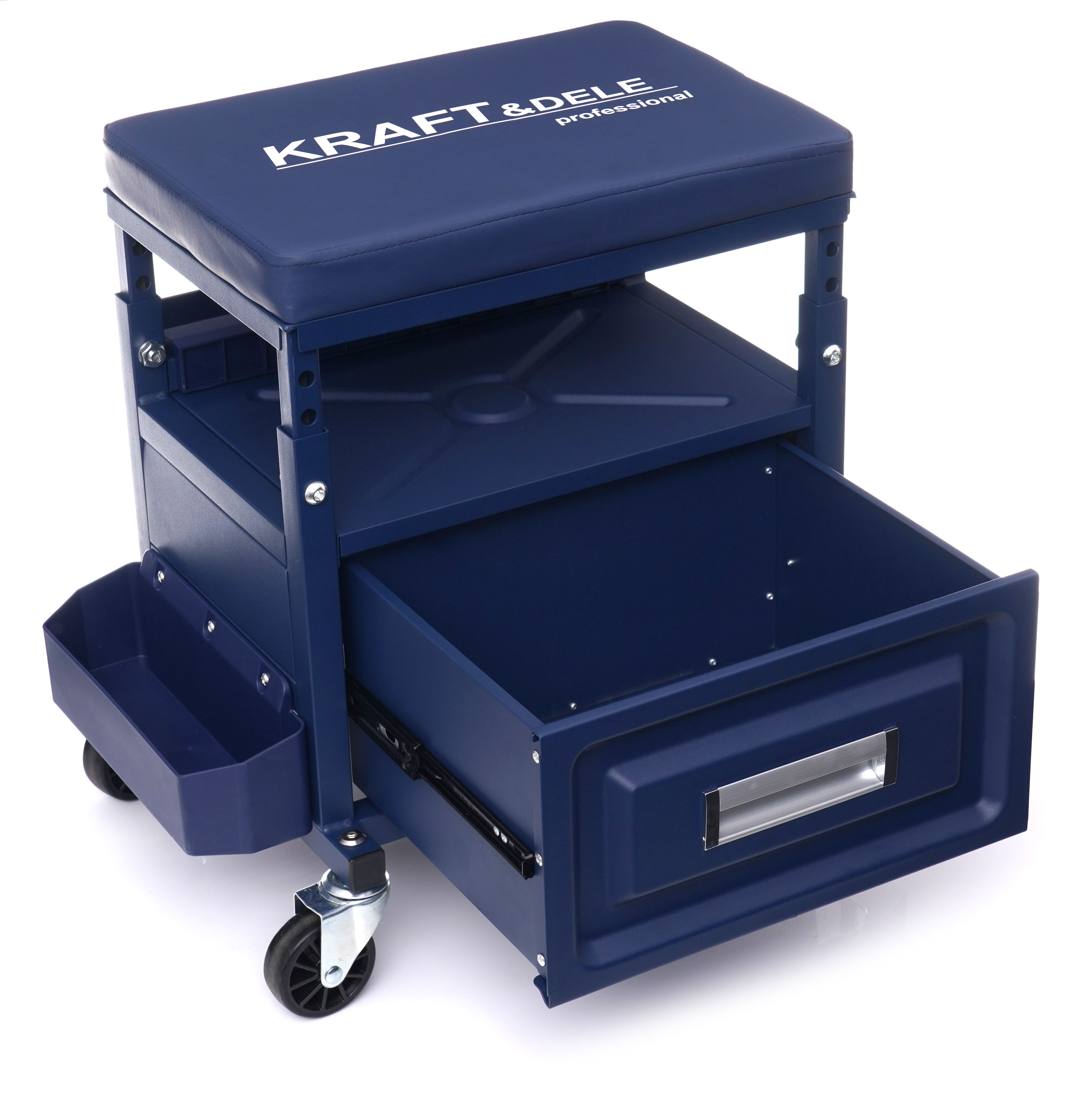 Dielenská stolička Dielenska stolička so zásuvkou KD10761 Dielenska stolička Kraft&Dele je určená na použitie v profesionálnych dielňach, autoservisoch, opravovniach a domácich garážach. Je vybavená priestrannou zásuvkou s nosnosťou približne 9 kg. Okrem toho má tri police, kde si môžete jednoducho odložiť náradie používané pri práci.
