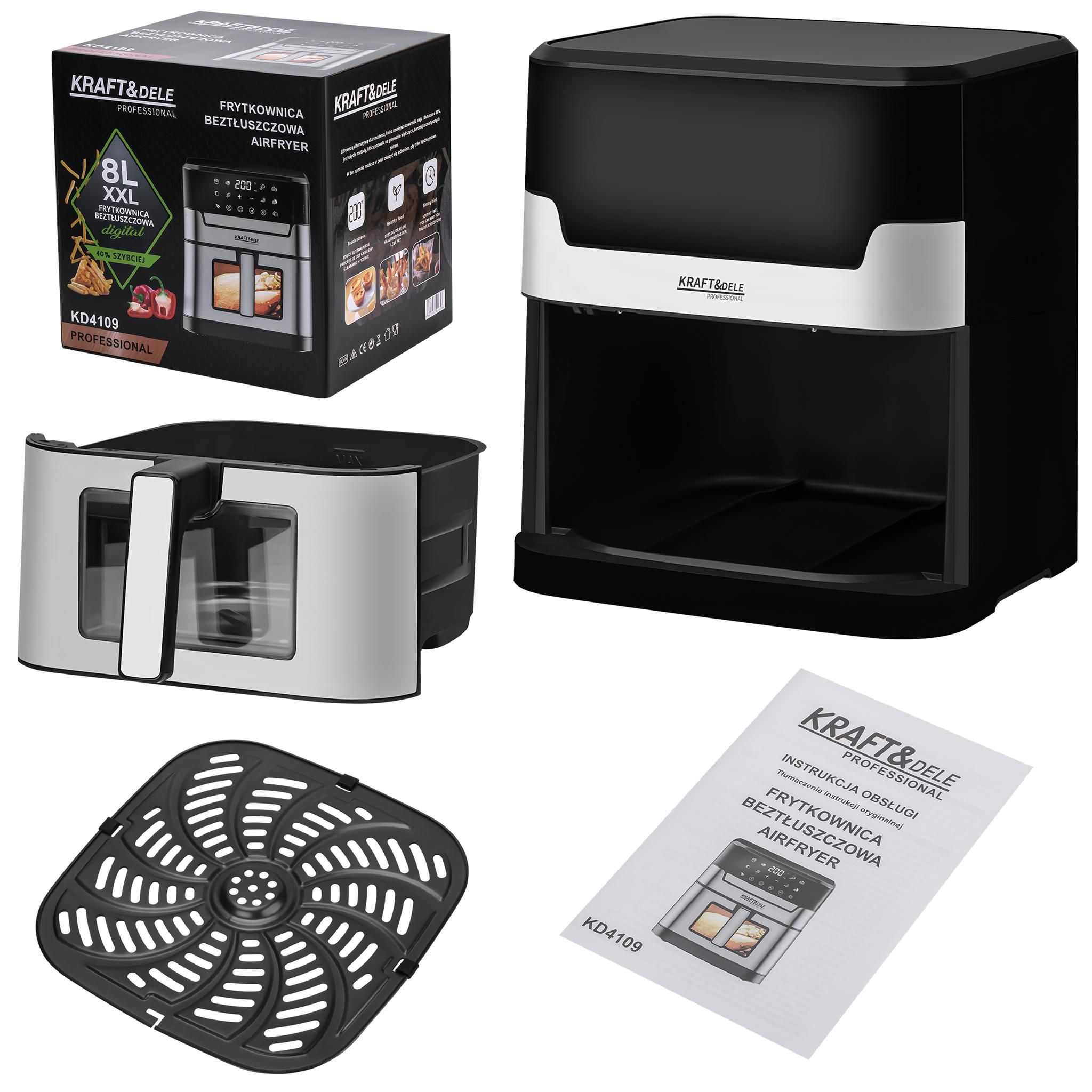 Horkovzdušná fritéza KD4109 je efektívny a moderný spotrebič s veľkým 8-litrovým objemom, ideálny na prípravu zdravých jedál pre celú rodinu. Vďaka výkonu 2200 W a technológii horúceho vzduchu môžete smažiť, piecť, grilovať a ohrievať bez použitia tuku. Zariadenie je vybavené LED displejom a preddefinovanými režimami varenia, ktoré uľahčujú každodennú prípravu rôznych jedál.