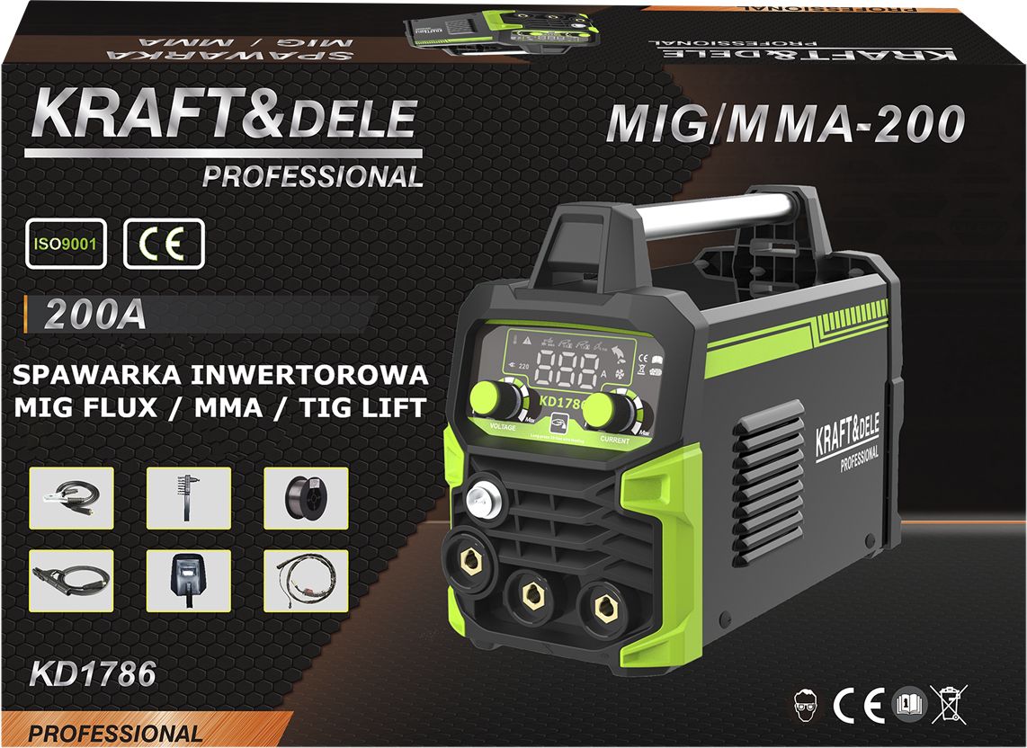 Invertorový zvárač; Zváračka MIG MMA TIG; 200A zváračka; Zváračka MIG FLUX; IGBT zvárač; dielenský zvárač; Zváračka KRAFT&DELE KD1786;