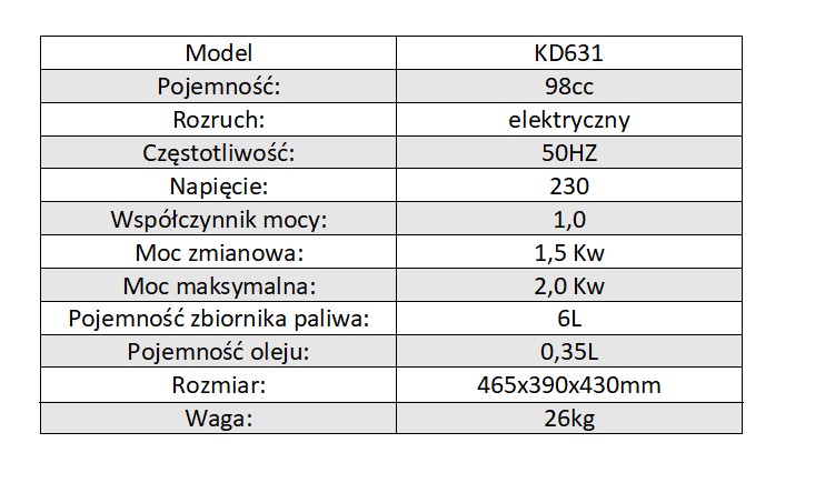 Prenosná jednofázová elektrocentrála s označením KD631 od Kraft&Dele je určená na výrobu 230V striedavého prúdu pomocou OHV 4-taktného spaľovacieho motora. Použitý dizajn Open Frame znižuje povrch a hmotnosť jednotky až o 20%. Je ideálny na stavby, domy, letné domy, kempingy a všade tam, kde potrebujeme spoľahlivý zdroj elektriny. Motor agregátu má pochrómovaný piest, takže sa vyznačuje tichým a plynulým chodom a zároveň je veľmi ekonomický. Gumové stabilizátory a uloženia motora agregátu zaisťujú tlmenie vibrácií a minimalizáciu hluku. Vďaka použitiu vhodného oleja (CDgrade alebo 10W-30, 15W-40) a snímaču nízkej hladiny oleja jednotka pracuje s hlučnosťou 66dBA, čo je o niečo hlasnejšie ako bežná reč na vzdialenosť približne 5m. Vlastnosti: • Výkon: 1,5/2 kW. • Napájanie: Bezolovnatý benzín 95/98. • Objem palivovej nádrže: 6 litrov. • Hmotnosť: približne 26 kg. • Dizajn otvoreného rámu: Znižuje hmotnosť a veľkosť. • 4-taktný motor OHV: Tichý a hladký chod, ekonomický. • Gumové stabilizátory a vankúšiky: Tlmia vibrácie a minimalizujú hluk. • Nízka hladina hluku: 66 dBA na vzdialenosť približne 5 metrov. • 6-litrová nádrž a nízka spotreba paliva • Záruka 12 mesiacov. Sada obsahuje • Jednofázovú elektrocentrálu KD631 • Kľúče na sviečky, skrutkovač • Káble na nabíjanie batérie • Návod na použitie v poľskom jazyku • Originálne balenie • Účtenku alebo faktúru.