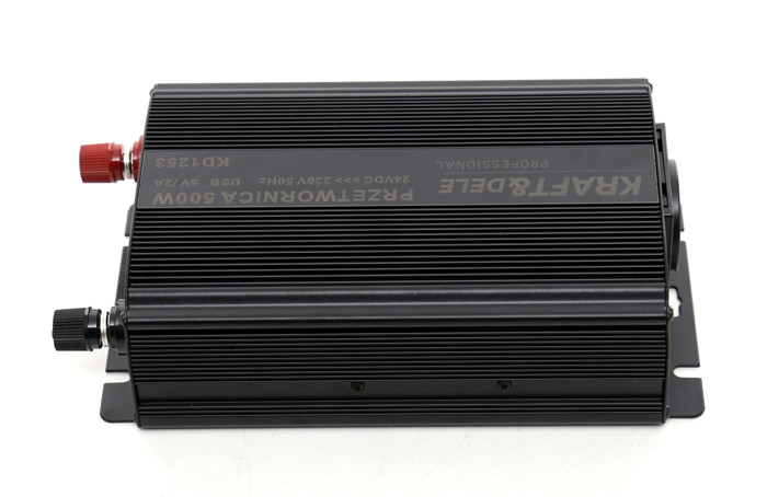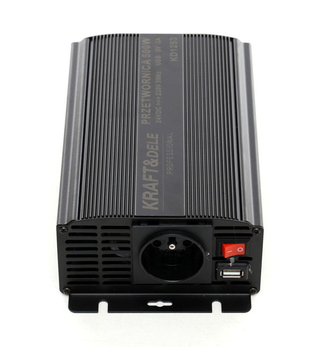 Prevodník prúdu 12 / 24VDC na 230VAC umožňuje pripojiť elektrické zariadenia na napájanie z autobatérie. Špeciálne navrhnutý systém umožňuje generovať prúd s trvalým výkonom 500W a okamžitým (impulzným) výkonom až 1000W. Zariadenie je vybavené funkciou vypnutia pri príliš vysokom alebo nízkom vstupnom napätí, ochranou proti prehriatiu, preťaženiu a poistkou proti skratu.