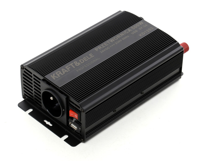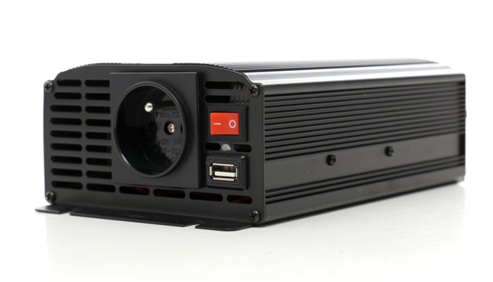 Prevodník prúdu 12 / 24VDC na 230VAC umožňuje pripojiť elektrické zariadenia na napájanie z autobatérie. Špeciálne navrhnutý systém umožňuje generovať prúd s trvalým výkonom 500W a okamžitým (impulzným) výkonom až 1000W. Zariadenie je vybavené funkciou vypnutia pri príliš vysokom alebo nízkom vstupnom napätí, ochranou proti prehriatiu, preťaženiu a poistkou proti skratu.