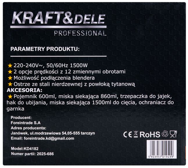 Tyčový mixér KD4182 je profesionálny kuchynský spotrebič s výkonom 1500W určený pre všestranné použitie v kuchyni. Vďaka rýchlosti až 15 000 ot./min. a titánovej čepeli si mixér poradí aj s tvrdými ingredienciami, čo zaisťuje rýchle a plynulé mixovanie. Zariadenie ponúka 12 nastavení rýchlosti, ktoré vám umožňujú presne prispôsobiť intenzitu práce typu pripravovaného jedla.