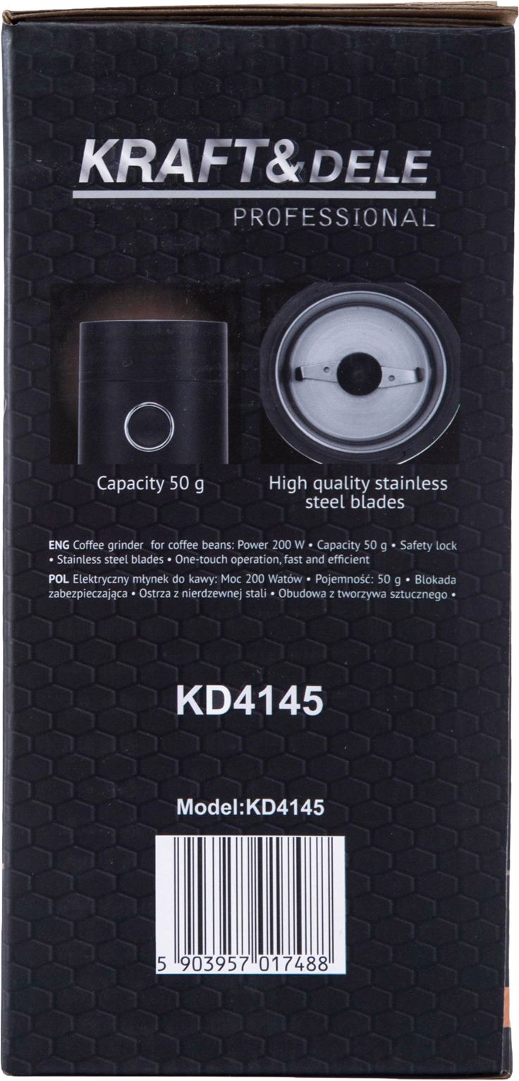 KD4145 je kompaktný a efektívny mlynček na kávu, ktorý vám umožní zomlieť čerstvé kávové zrná v priebehu niekoľkých okamihov a zaručiť tak aromatickú a chutnú rannú kávu. Vďaka ostrým čepeliam a 200W motoru zariadenie zaručuje rýchle a rovnomerné mletie.