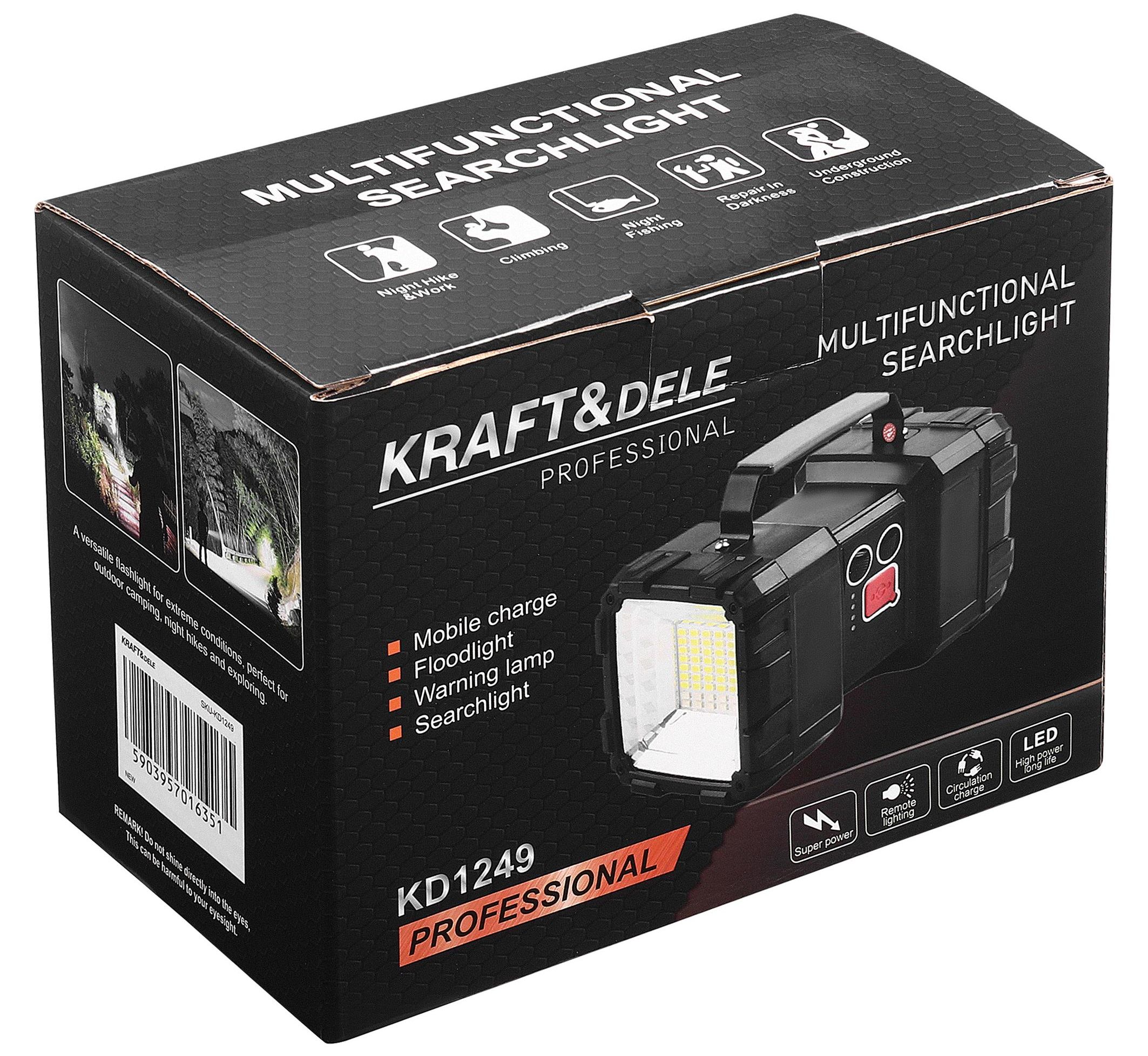 Všestranné LED svietidlo KD1249 od spoločnosti KRAFT&DELE kombinuje osvetlenie, nabíjačku mobilných zariadení a výstražné svetlo. Vďaka výkonným LED diódam a rôznym režimom svietenia je ideálne na domáce, dielenské a outdoorové aktivity a poskytuje dlhotrvajúci a spoľahlivý zdroj svetla.