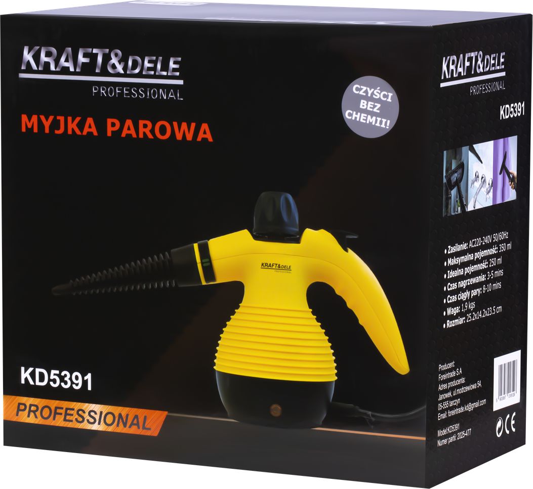KD5391 je kompaktný a efektívny parný čistič od spoločnosti KRAFT&DELE, určený na čistenie rôznych povrchov pomocou horúcej pary. Zariadenie dokonale odstraňuje nečistoty, mastnotu, baktérie a vírusy bez použitia čistiacich prostriedkov – iba pomocou sily pary. Je ideálny na použitie doma, v dielni, v kuchyni, v kúpeľni, v aute alebo na čistenie čalúnenia.