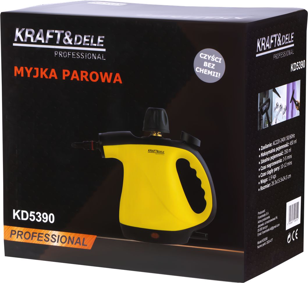 KD5390 je kompaktný a efektívny parný čistič od spoločnosti KRAFT&DELE, určený na čistenie rôznych povrchov pomocou horúcej pary. Zariadenie dokonale odstraňuje nečistoty, mastnotu, baktérie a vírusy bez použitia čistiacich prostriedkov – iba pomocou sily pary. Je ideálny na použitie doma, v dielni, v kuchyni, v kúpeľni, v aute alebo na čistenie čalúnenia.