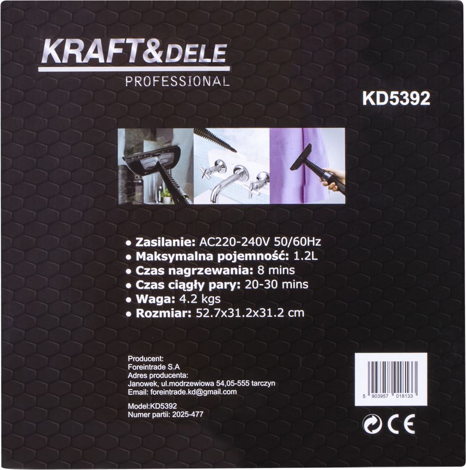 KD5392 je moderný a efektívny parný čistič, ideálny na každodenné upratovanie domácnosti. Vďaka vysokému výkonu a tlaku pary účinne odstraňuje nečistoty, mastnotu a baktérie bez použitia čistiacich prostriedkov, vďaka čomu je bezpečný pre vaše zdravie a životné prostredie.