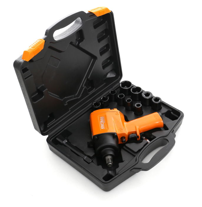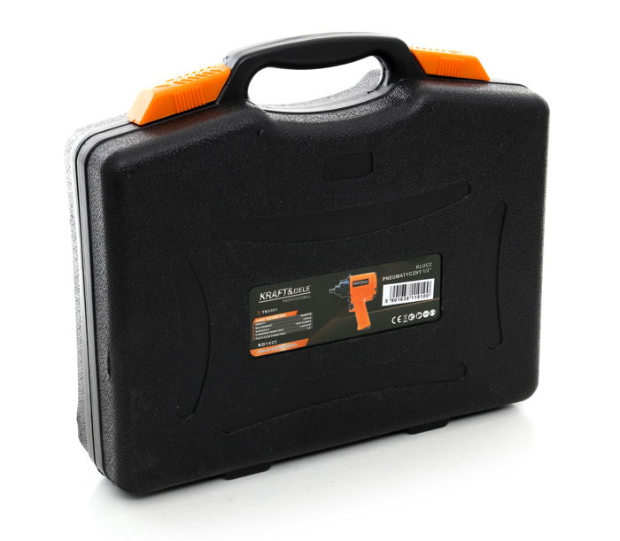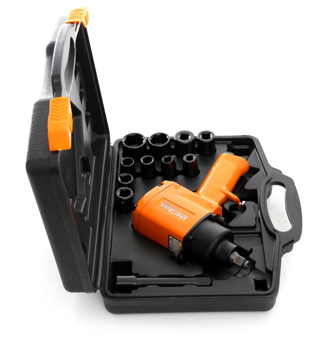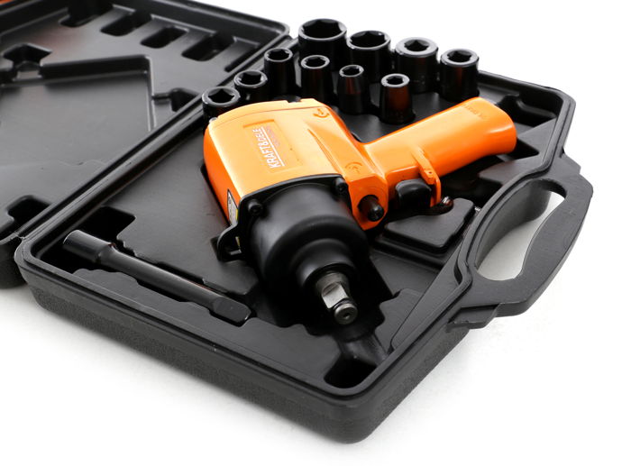 Pneumatický uťahovák je zabalený v praktickom kufríku spolu s nadstavcami z ocele.