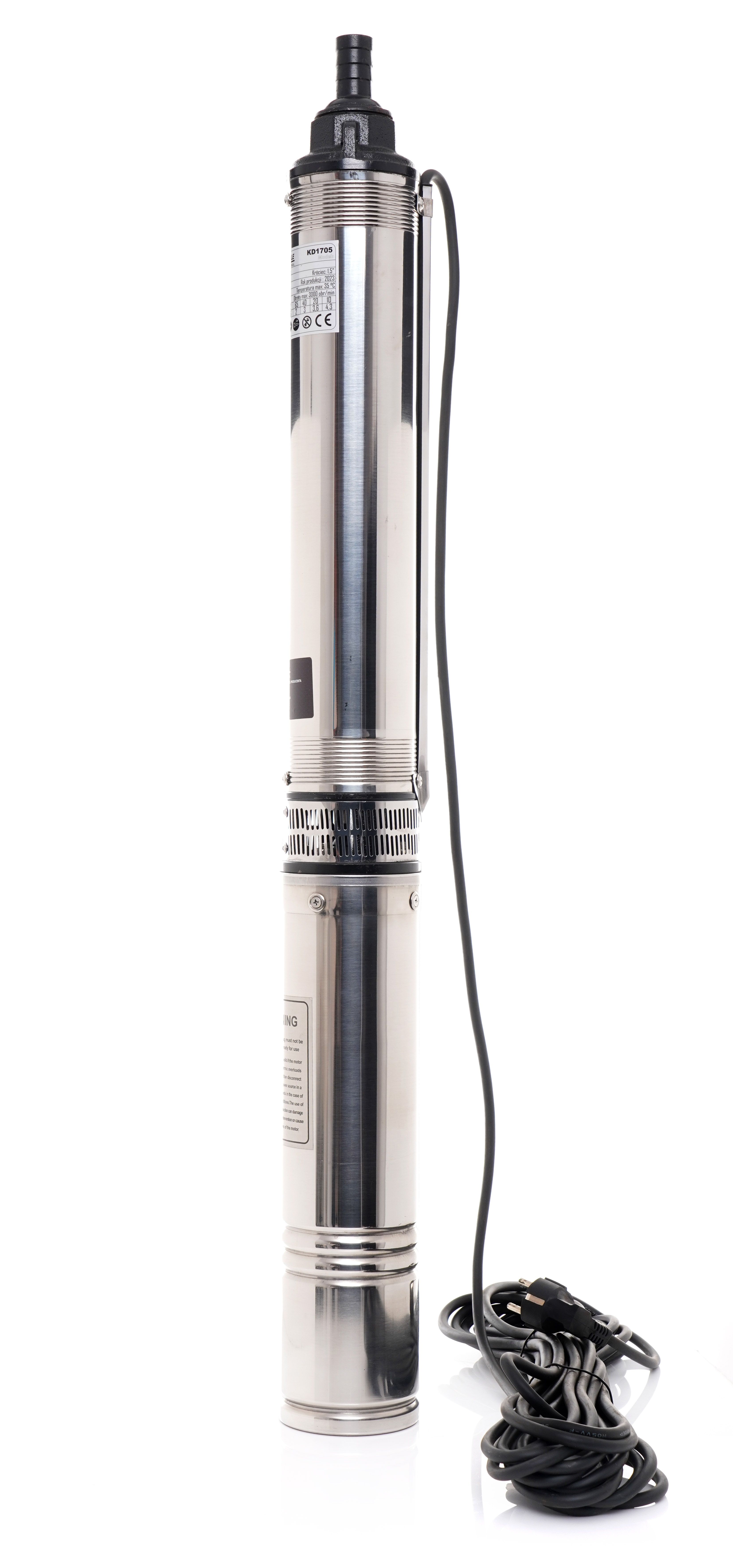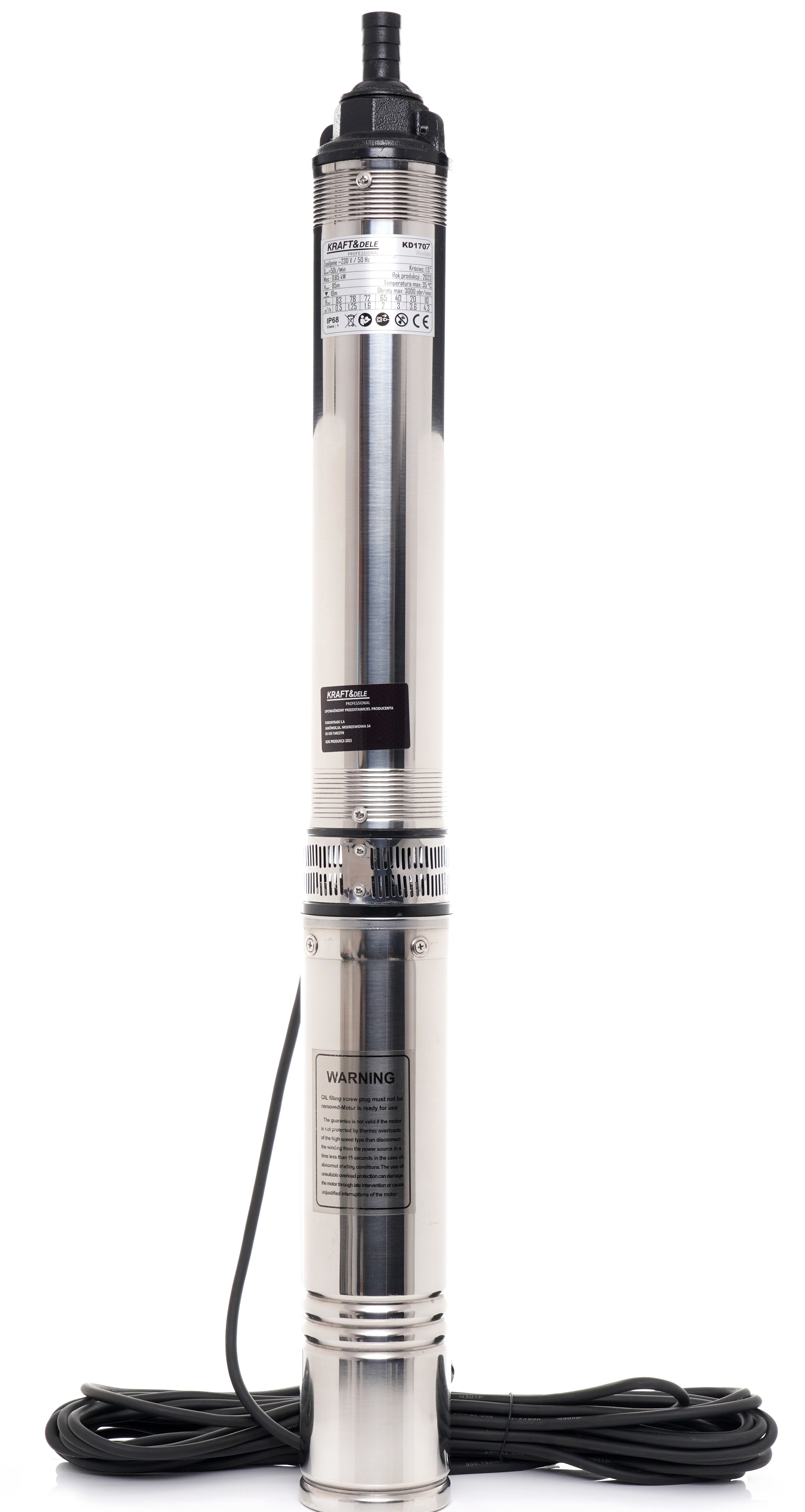 /min Maximálny zdvih: 110 m Maximálny prietok: 50 l/min Dĺžka kábla: 15 m Veľkosť čerpadla: 4"-100 mm Hmotnosť: približne 11 kg Ponorné čerpadlo Kraft&Dele KD1707 je ideálne na čerpanie čistej vody a na použitie v hydrofórových systémoch. Zariadenie je vhodné na čerpanie vody pre rodinné domy a rekreačné pozemky. Je vyrobené z pevnej kovovej zliatiny.