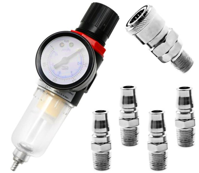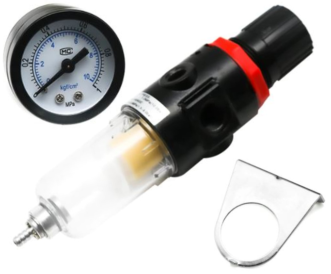 Reduktor tlaku pre pneumatické zariadenia vybavené kompletným blokom prípravy vzduchu. Presný tlakomer s dvojitou skalnou lištou a PSI v sklenenom kryte umožňuje konštantnú kontrolu tlaku.