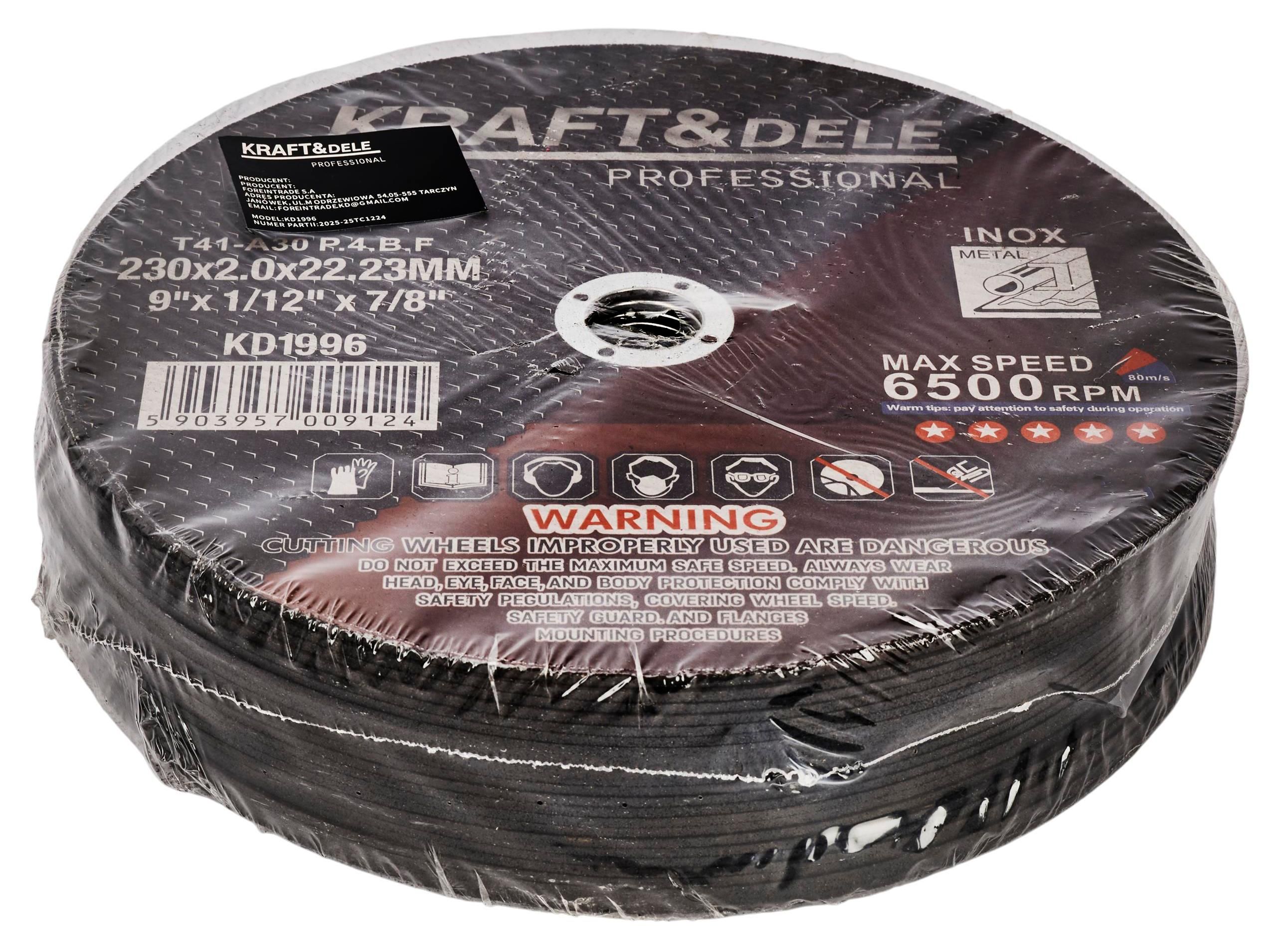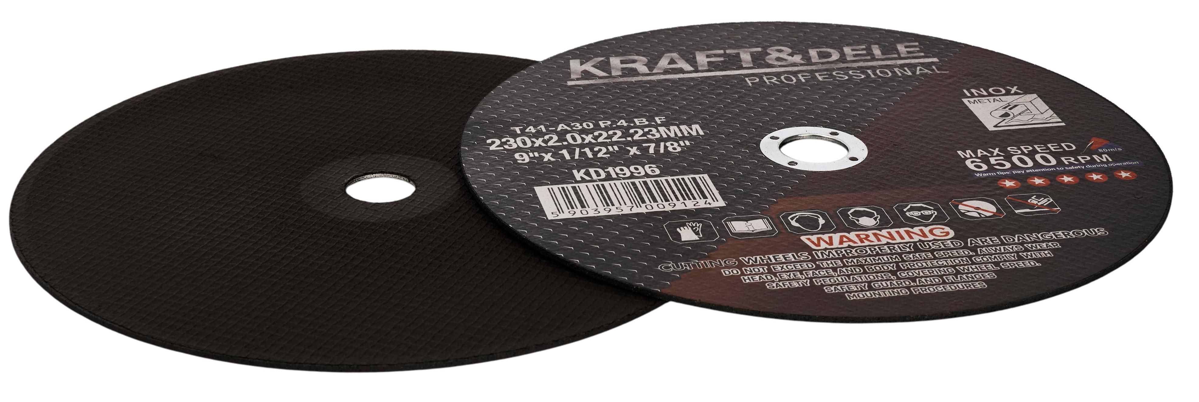 Rezný kotúč 230x2,0x22,23mm KD1996 Rezný kotúč na kov 230 x 2,0 x 22,23 mm MINIMÁLNY ODBER 25 KS - BALENIE Výkon, presnosť a odolnosť – kotúče Kraft&Dele KD1996 sú určené pre náročných používateľov, ktorí očakávajú spoľahlivé rezanie oceľových a kovových komponentov. Sú ideálne pre dielne, priemyselné závody a stavebné projekty. Vďaka použitiu vysoko kvalitného brúsneho zrna z oxidu hlinitého v kombinácii so syntetickou živicou a vystužené sklolaminátovou tkaninou tieto kotúče zabezpečujú vysoký výkon, odolnosť proti zlomeniu a bezpečnosť práce.