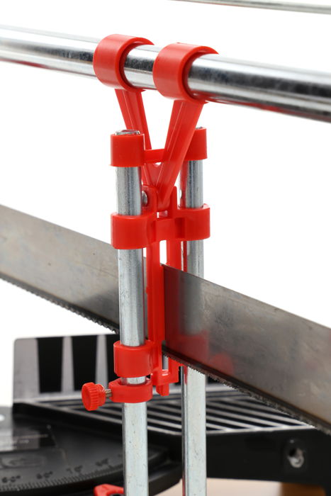 Píla je vybavená nastaviteľným dorazom hĺbky rezu, dorazom dĺžky, svorkou, gumovými nožičkami a stabilným pracovným stolom 450 mm z liateho hliníka.