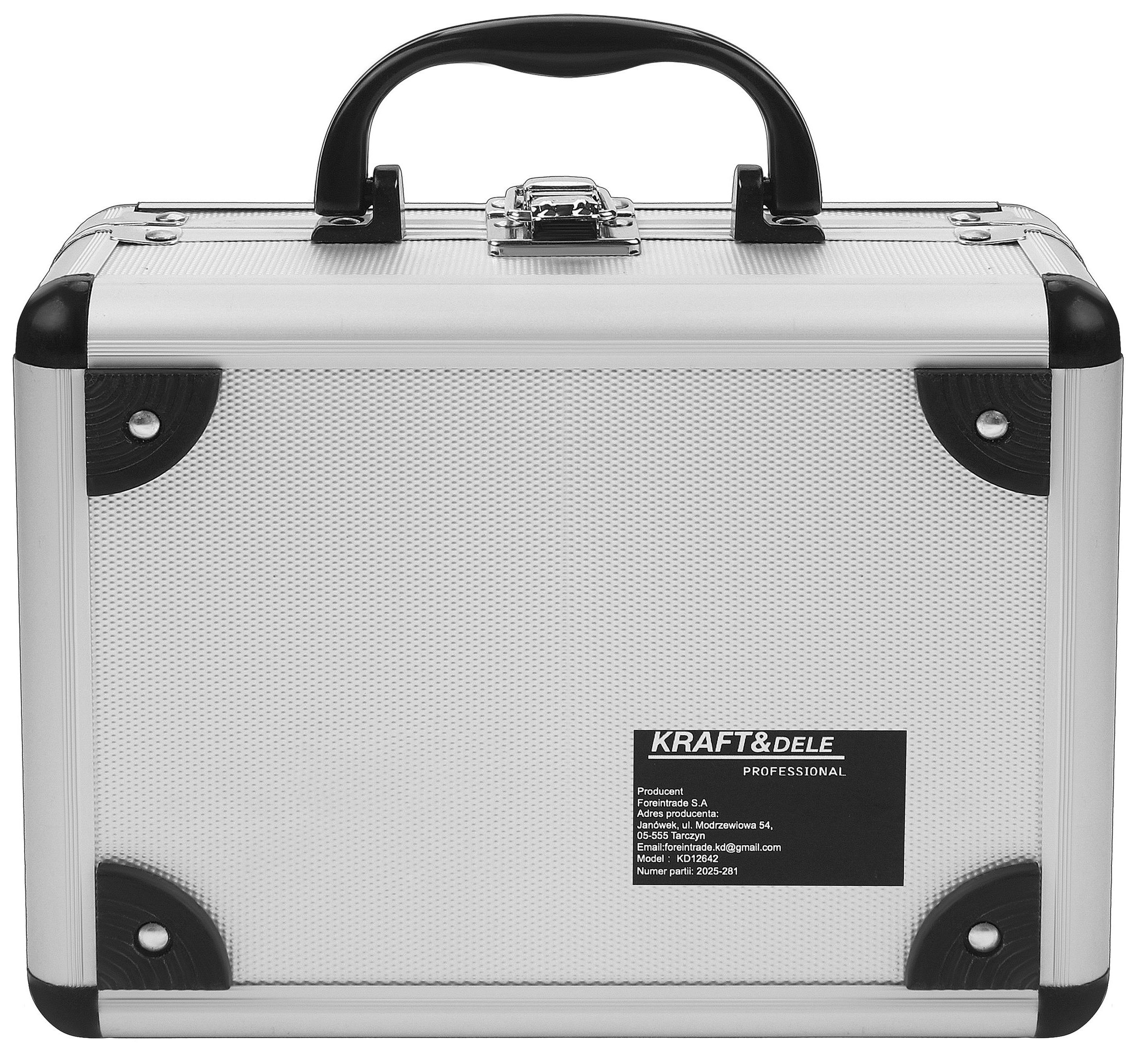 Komponenty sady sú starostlivo zabalené v pevnom kufríku s rukoväťou na prenášanie a uzamykateľnou sponou, čo uľahčuje organizáciu náradia a jeho bezpečné uloženie.