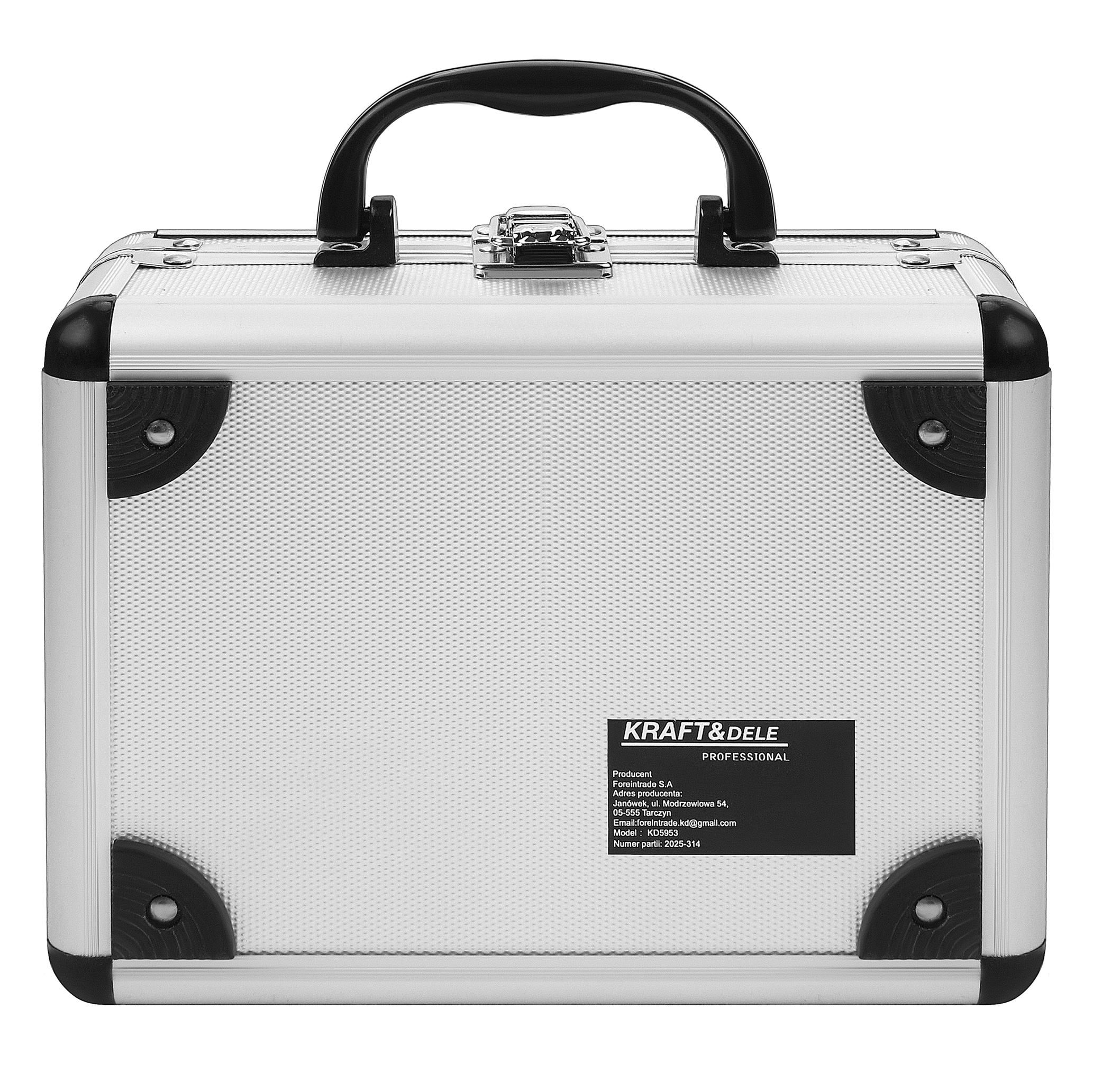 Komponenty súpravy sú starostlivo zabalené v pevnom kufríku s rukoväťou na prenášanie a uzamykateľnou prackou, čo uľahčuje organizáciu náradia a jeho bezpečné uloženie.