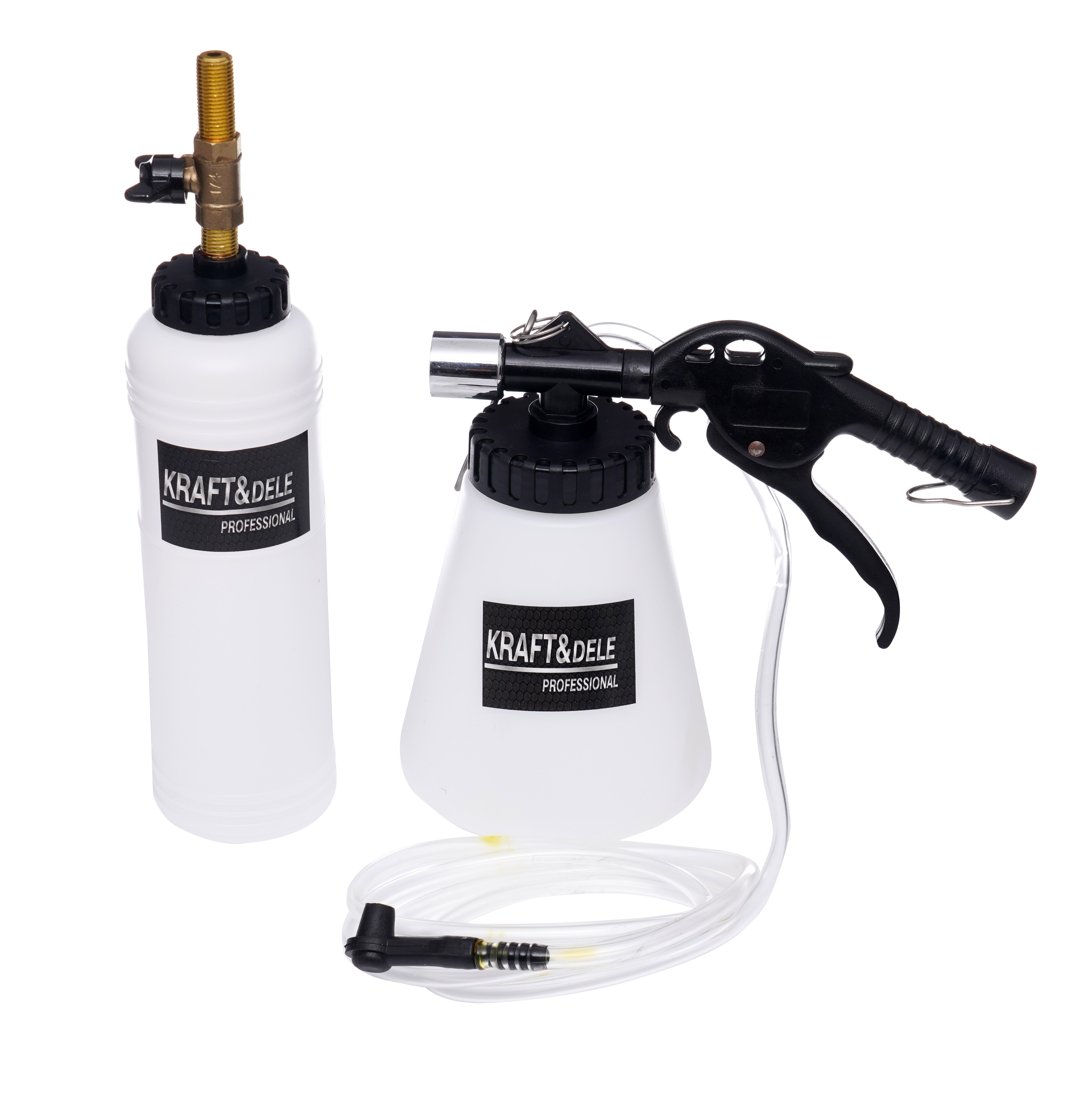 Profesionálna súprava na odvzdušnenie / výmenu brzdovej kvapaliny od Kraft&Dele, model KD1457, je ideálna aplikácia pre mechanikov v autodielňach. Umožňuje samostatnú výmenu brzdovej kvapaliny nasávaním zo systému pomocou tlaku pneumatického systému.
