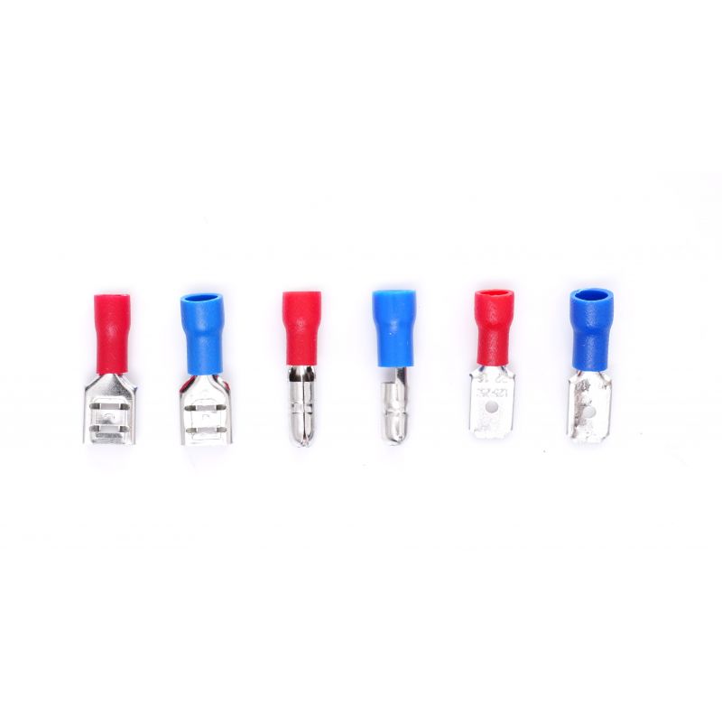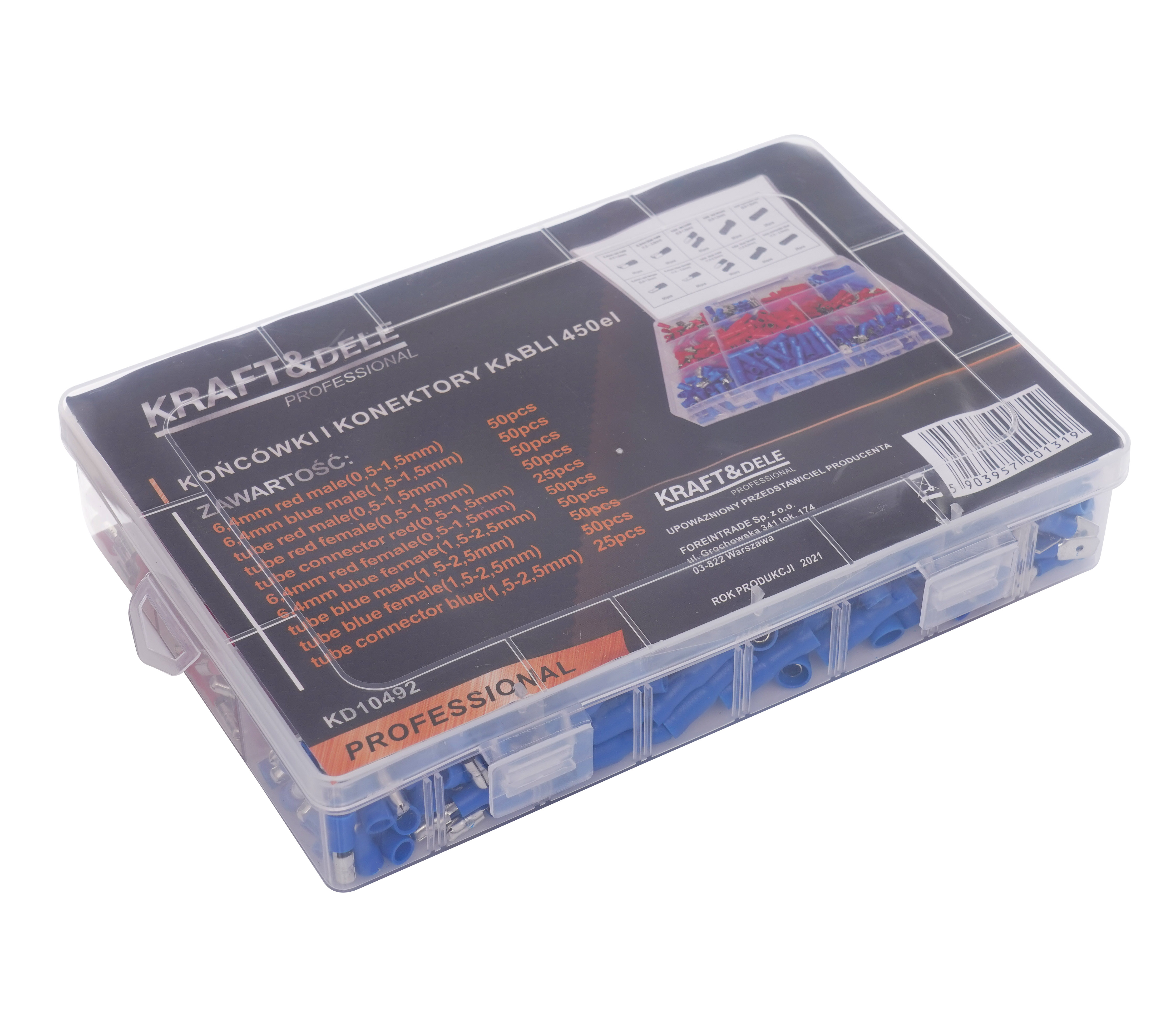Auto prípojky na káble, samce, samice a rúrkové konektory značky Kraft & Dele, model KD10492, dodávané v pohodlnom, pevnom obale, ktorý uľahčuje segregáciu na jednotlivé typy konektorov. Konektorové svorky slúžia na prepojenie káblov s elektrickými zariadeniami, inými káblami atď.