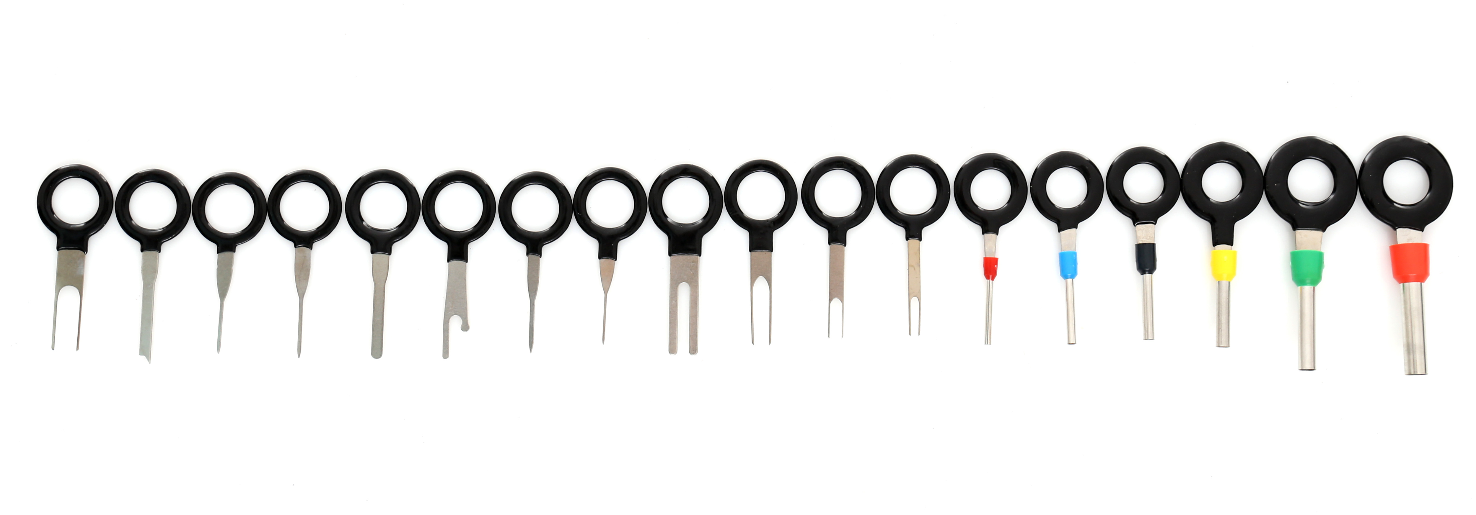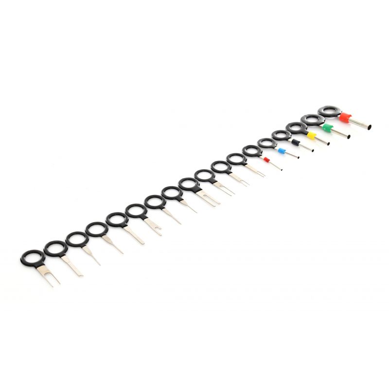 Sada 18 kľúčov na odstránenie kolíkov a konektorov. Ich rukoväť je potiahnutá gumou, čo zvyšuje komfort práce. Takáto zostava je nevyhnutnou výbavou každého elektrikára. Je mimoriadne užitočná pri úpravách a opravách elektroinštalácie v aute, motorke, lodi, ale aj v domácnosti pri opravách domácich spotrebičov, rtv a počítačov. Sú ergonomicky tvarované, vďaka čomu je demontáž veľmi jednoduchá. Môžete tiež pracovať so zlomeným kolíkom alebo ohnutou spojovacou doskou. A čo je najdôležitejšie - odstraňovače nepoškodzujú špendlíky.