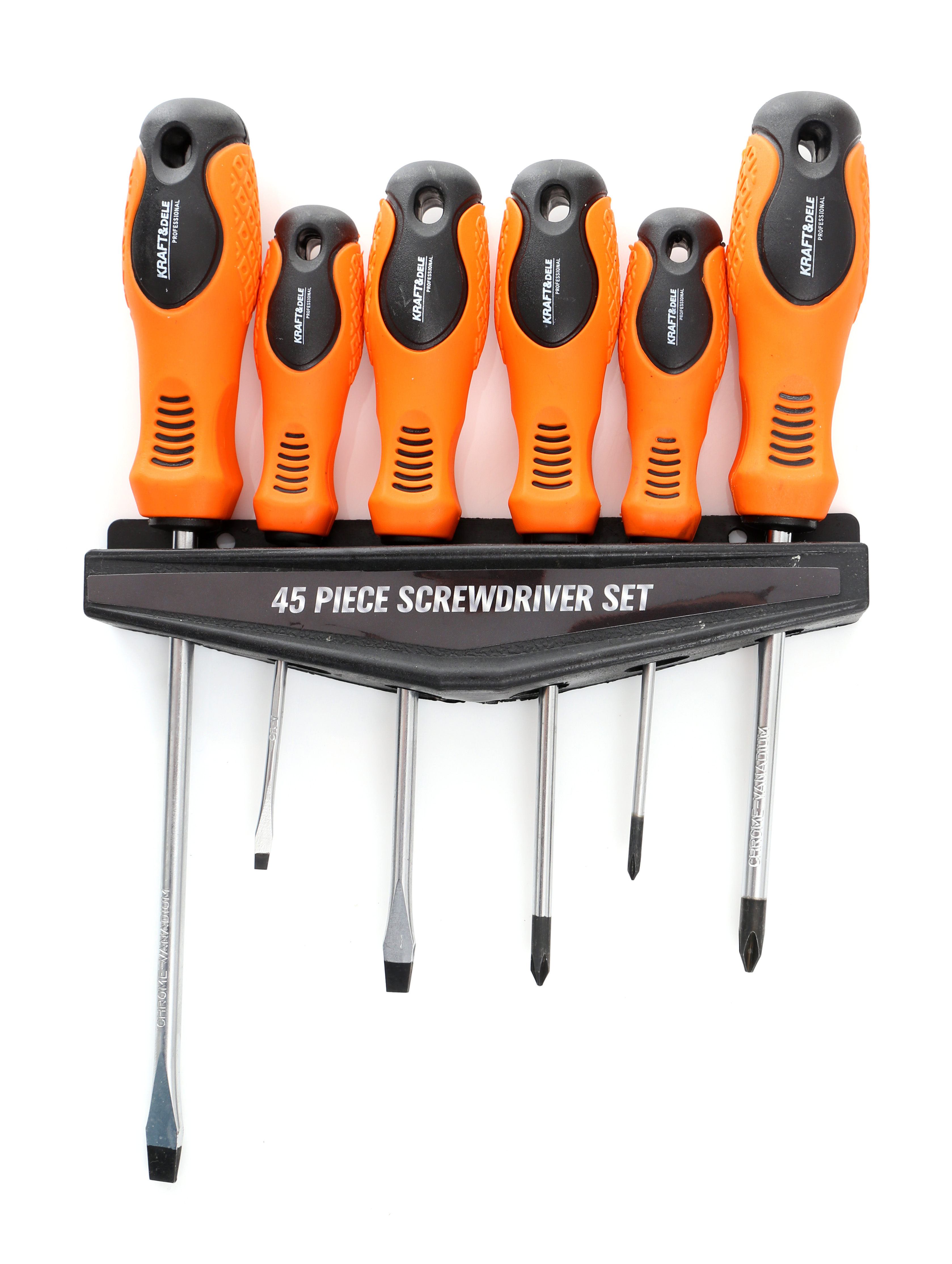Skrutkovače, bity a kliešte sú z vysoko kvalitných materiálov, čo predlžuje ich životnosť. Sada obsahuje 45 prvkov a hodí sa do ktorejkoľvek garáže a dielne.