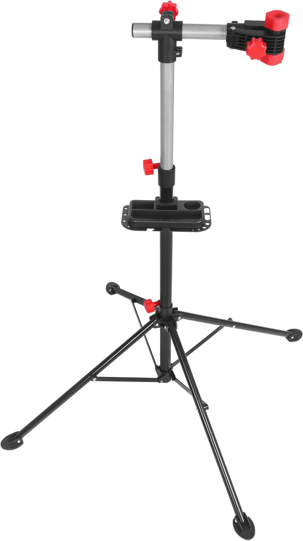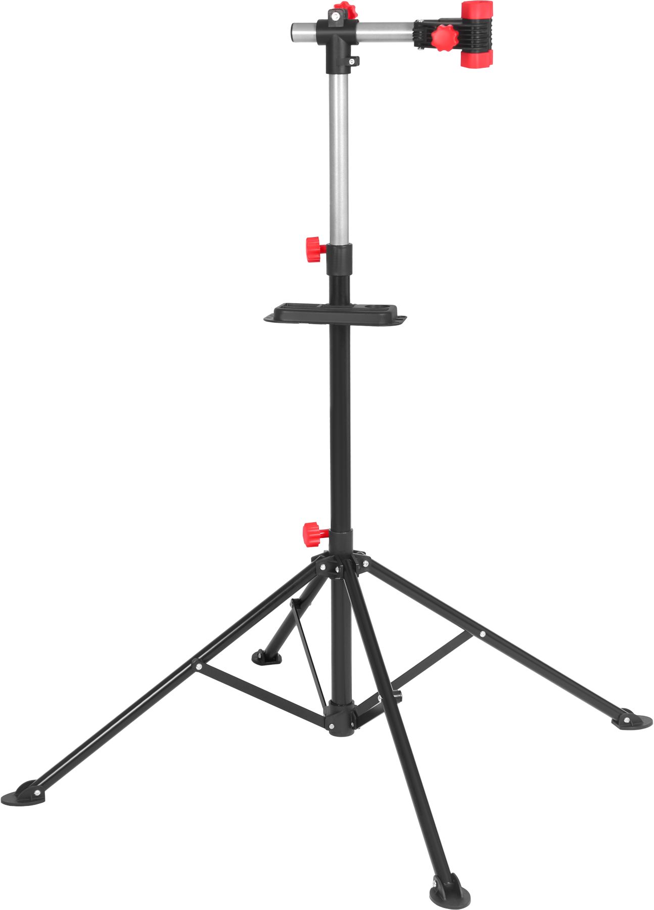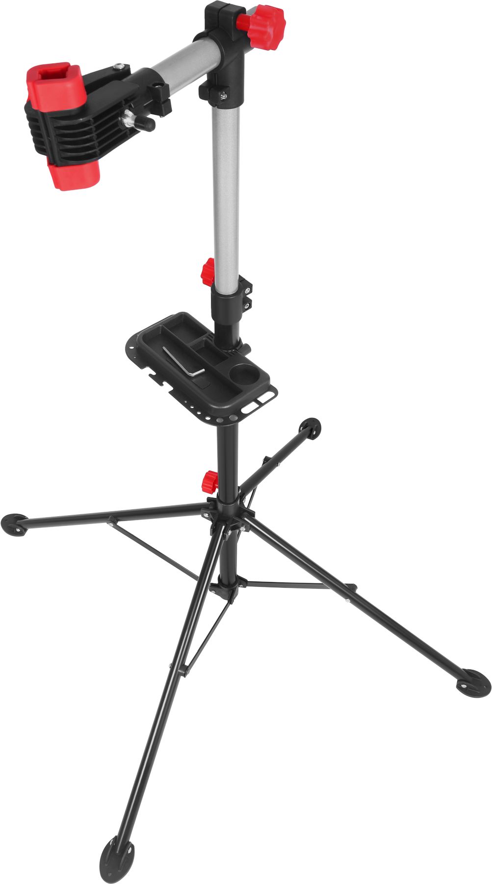 Nastaviteľná výška stojana a pogumované čeľuste chránia rám bicykla pred poškriabaním. Vstavaná polica na náradie a skrutky s magnetom vám umožní mať všetko poruke, čo výrazne uľahčuje servis.