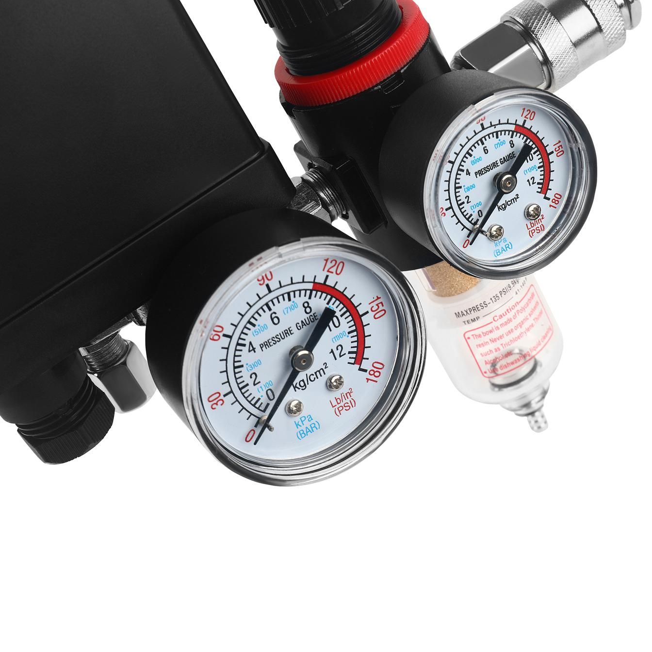 Tlakový spínač automaticky zapne kompresor pri tlaku 6 barov a vypne pri tlaku 8 barov s nastaviteľným vypnutím až do 12 barov. Integrovaný redukčný ventil a poistný ventil uľahčujú spustenie, zatiaľ čo vstavaný odvádzač kondenzátu zabezpečuje účinné odvádzanie kondenzátu, čím zvyšuje bezpečnosť a odolnosť kompresora.
