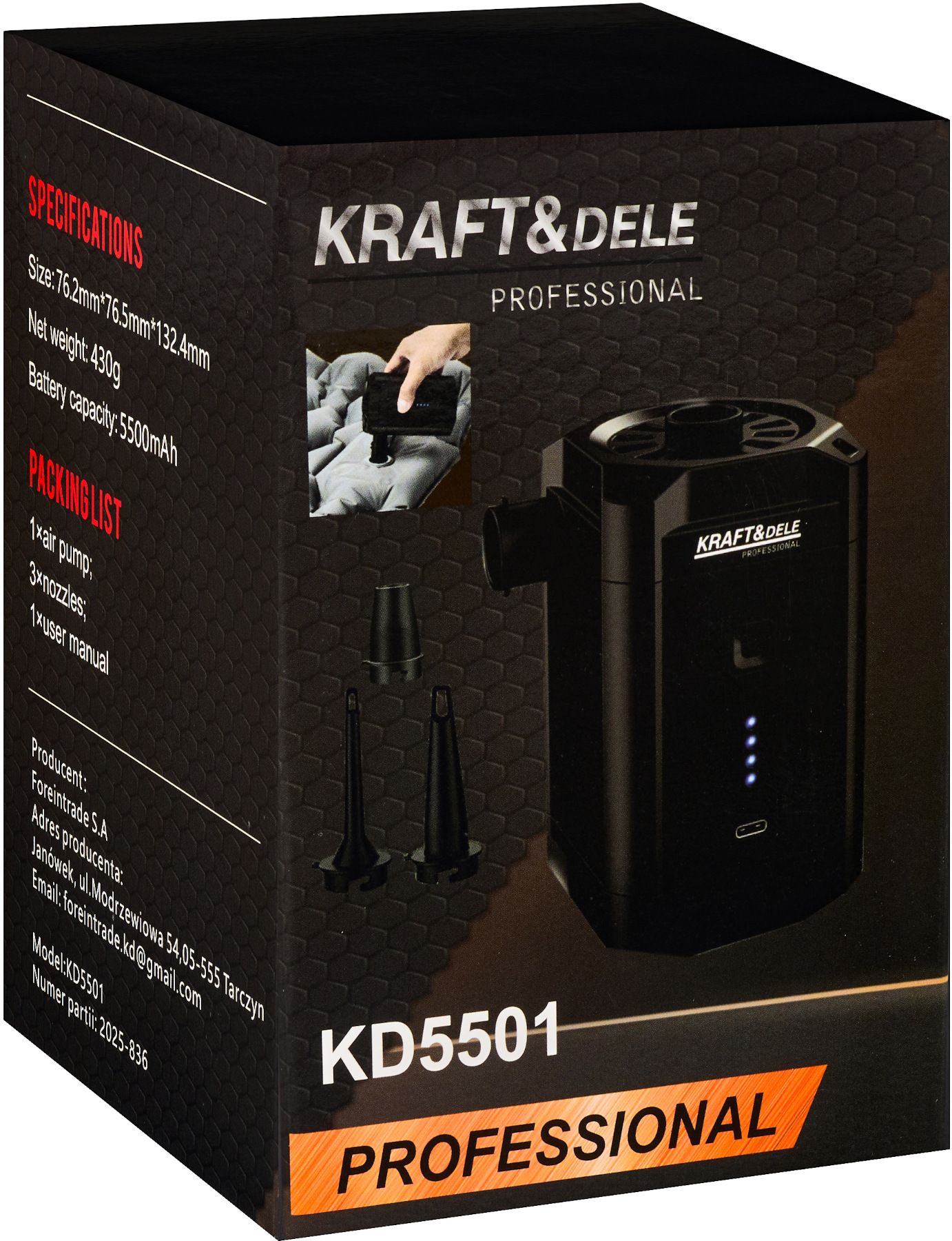 KD5501 je kompaktná a mimoriadne praktická bezdrôtová pumpa od spoločnosti KRAFT&DELE, určená na rýchle nafukovanie a vyfukovanie matracov, raftov, nafukovacích hračiek a cestovných doplnkov. Vďaka svojej ľahkej konštrukcii a robustnému puzdru z ABS + PC je ideálna na použitie doma aj na cestách.