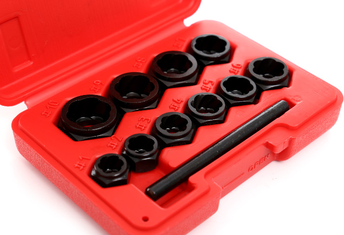 Sada 10 vykružovačov značky Kraft&Dele model KD10269 obsahuje hlavice na poškodené skrutky v 10 veľkostiach: 9, 10, 11, 12, 13, 14, 15, 16, 17 a 19 mm.