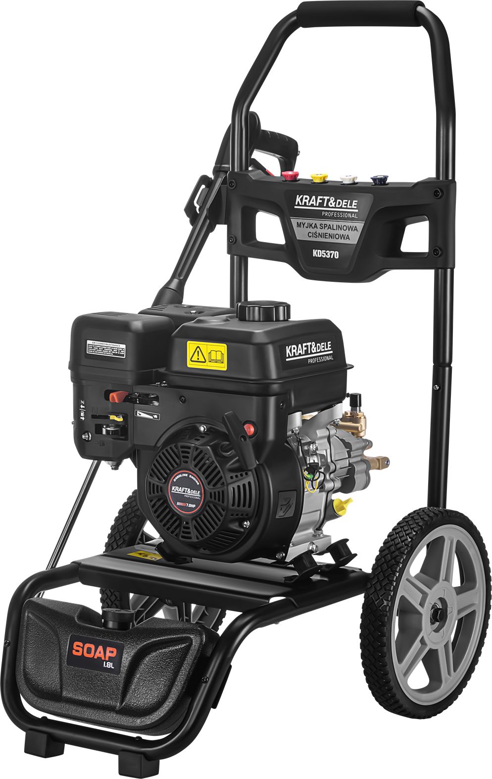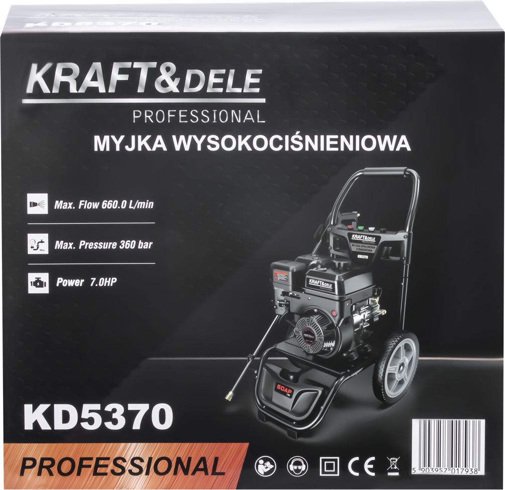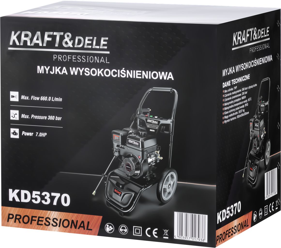 KD5370 je výkonný vysokotlakový čistič od spoločnosti KRAFT&DELE vybavený výkonným spaľovacím motorom s výkonom 7 HP. Je určený na intenzívne používanie a je ideálny na čistenie vozidiel, poľnohospodárskych strojov, dlažobných kociek a fasád. Vďaka vysokému prevádzkovému tlaku a vysokému prietoku vody čistič účinne odstraňuje aj tie najodolnejšie nečistoty.