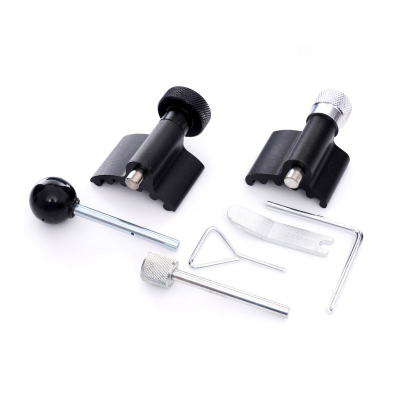 Profesionálny nástroj na aretáciu rozvodových kladiek. Súprava umožňuje znehybnenie rozvodov v servisnej polohe pri výmene rozvodového remeňa. Špeciálny tvar zámkov umožňuje presné nastavenie kontrolných bodov zapaľovania. Zámky znehybnia ozubené koleso rozvodového a kľukového hriadeľa a koleso napínača remeňa. Odporúča sa pre profesionálne použitie v špecializovaných autoservisoch. Celý set je zabalený v praktickom kufríku